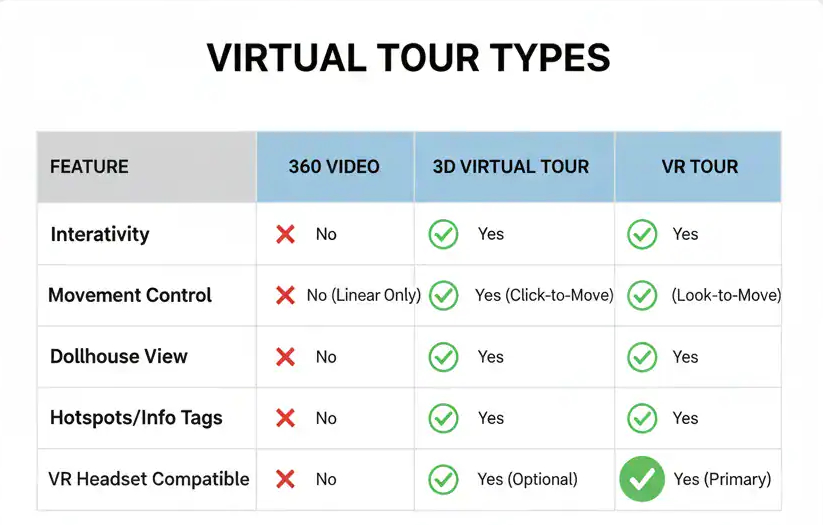 The term “Virtual Tour” encompasses a wide range of meanings, yet the underlying technology differs significantly. Grasping these distinctions is essential for selecting the most suitable option for your listings.